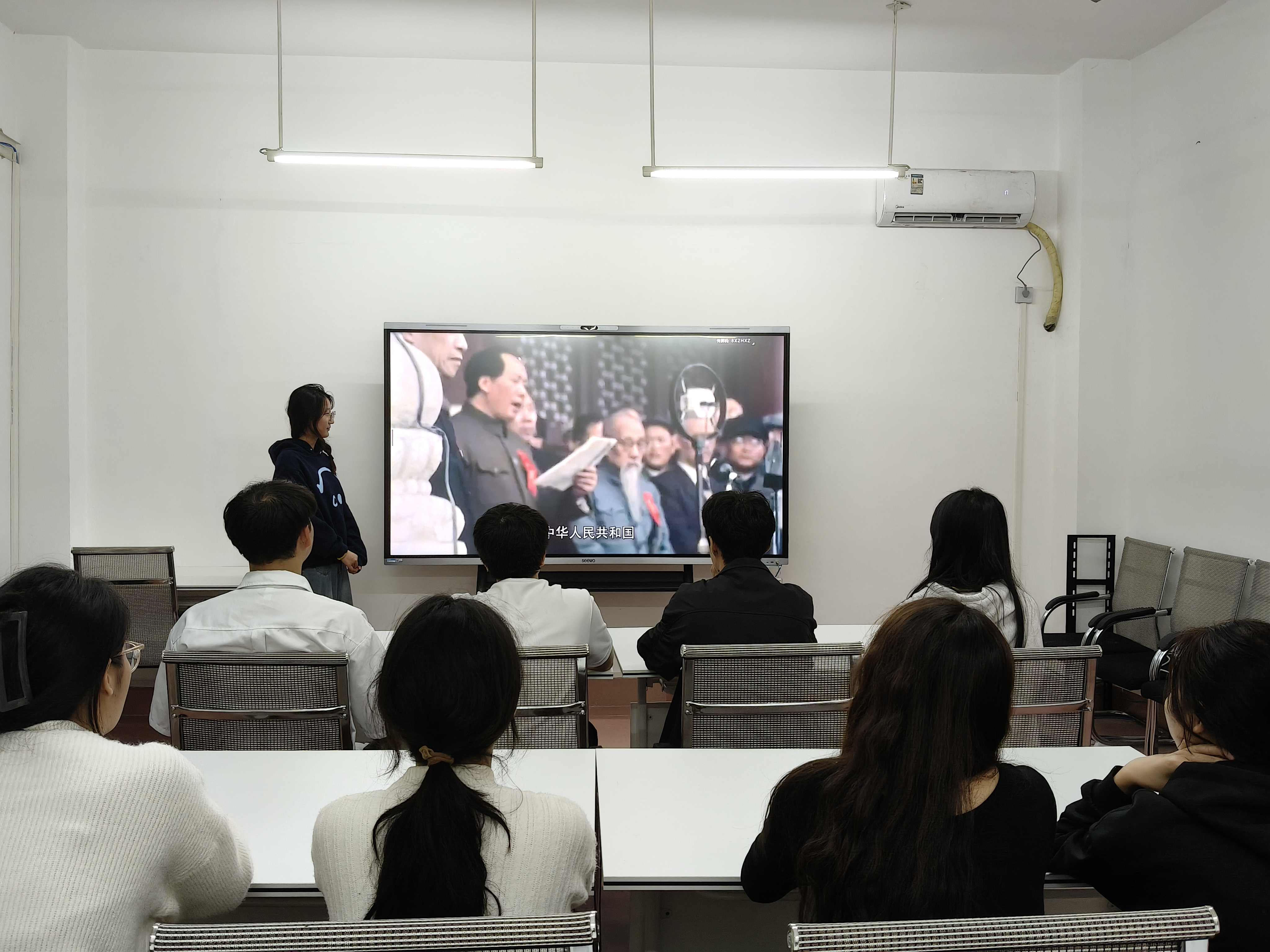 随后,全体党员观看《开国大典》经典片段与2025年国庆天安门升旗仪式片段。视频中,1949年开国大典的庄严宣告与2025年天安门广场的升旗盛况交相辉映,完整展现了共和国从奠基到迈向强国的壮阔历程。观看结束后,党员们深受触动,纷纷表示要铭记76年波澜壮阔的奋斗史,将初心使命践行于学习与实践,为强国建设贡献青春力量。