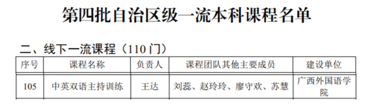 近日,自治区教育厅正式公布了第四批自治区级一流本科课程认定结果,我院《中英双语主持训练》线下课程成功获批。该课程由王达副教授担任负责人,课程团队成员包括刘蕊、赵玲玲、廖守欢、苏慧等四位教师。该课程的成功获批,凝聚了课程团队长期在教学创新与实践探索中的努力,也展现了我院区级基层教学组织“双语播音主持课程组”在国际传媒教育方面深耕的成果,标志着我院在课程建设方面实现了重大突破。